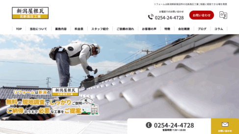 北新高圧工業は1970年の創業以来、新潟県新発田市を拠点として屋根瓦工事の専門店として歩み続けています。地元の皆様に支えられながら45年以上にわたり商売を続け、これまでに2万件以上の屋根瓦リフォームを手がけてまいりました。 かわらふき一級技能士、瓦屋根工事技士、瓦屋根診断技士の資格を持つプロのスタッフがチームとして連携し、お客様に質の高い屋根瓦リフォームをお届けできることが当社の強みです。他社には真似できないお客様とのつながりを大切にし、各スタッフが最高のパフォーマンスを発揮してお客様にお喜びいただけるサービスを提供しています。