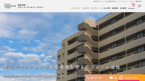 株式会社カラーコーディネイト・タイヨーは、岡山県内で200件を超えるマンション・アパート・ビルなどの大型物件の施工実績を持ち、外壁塗装から屋上防水まで総合的な改修工事を手がけています。創業から約100年という長い期間にわたって蓄積してきた確かな施工技術と豊富なノウハウを活かして、建物の資産価値向上と美観改善を同時に実現する提案を行っています。一級・二級建築施工管理技士や一級・二級建築士といった国家資格保有者が多数在籍しており、専門的な知識と技術を活用した高品質な施工を提供しています。