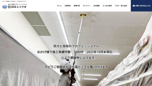株式会社GIGエコラボの施工は、まずカビを除去し、表面に見えているカビを全て排除することから始まります。次に殺菌を行い、見た目だけの対応では殺菌できない深部のカビを退治していきます。通常のカビ取り剤だけでは除菌できない深部のカビまで徹底的に処理し、最後に抗菌(防カビ)を行いながら再発を防いでいきます。