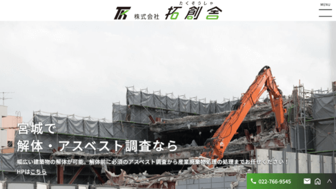 木造住宅から大規模な工場・倉庫まで、建物の構造や用途を問わない幅広い解体工事を手がける株式会社拓創舎は、宮城を拠点にアパート・店舗・物置といった多様な建築物の取り壊しに対応しています。重機操作の高い技術力に加え、粉塵抑制・騒音対策を施工プロセスの基本として組み込むことで、現場周辺の生活環境への影響を最大限に抑えながら確実な施工を進めています。