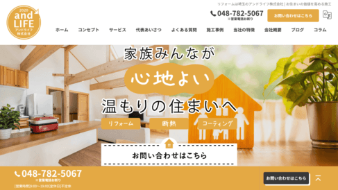 埼玉エリアを主な活動圏とするアンドライフ株式会社は、断熱サッシ・内窓設置・床下断熱材の導入を得意分野の中心に据えながら、壁紙・外壁の補修やキッチン・浴室の改修、フルリノベーションまで、住まいに関する幅広い相談に対応しています。